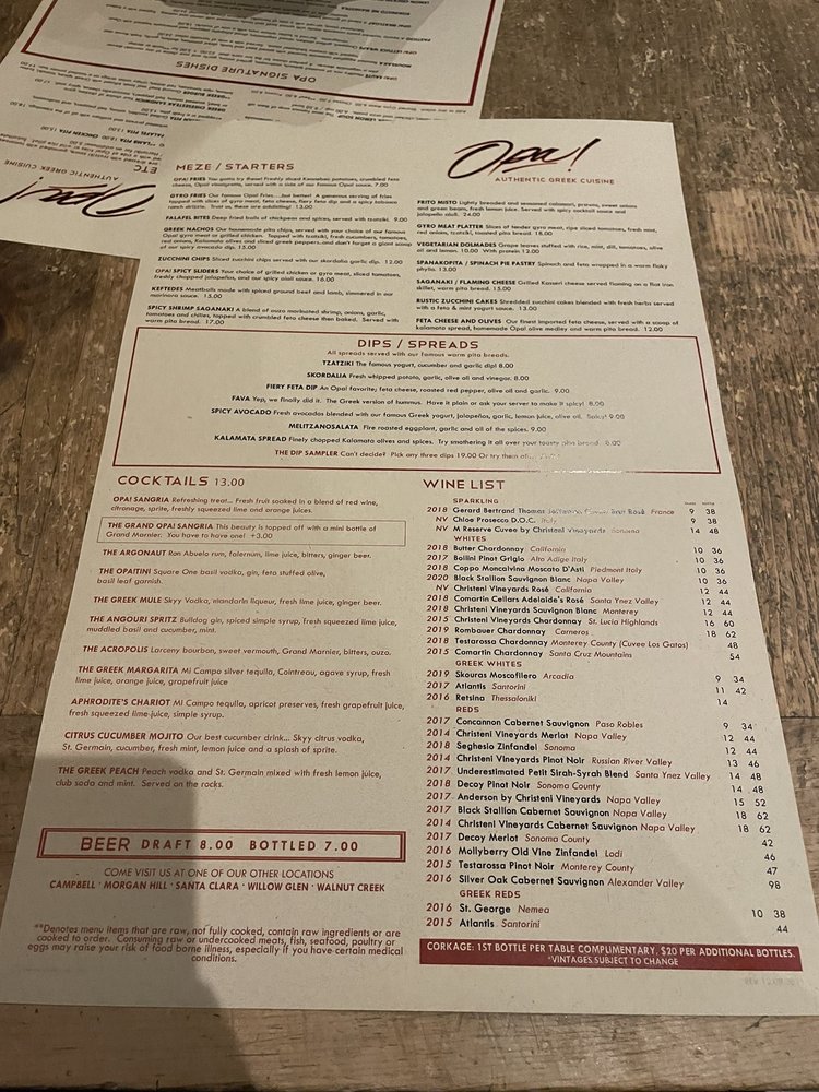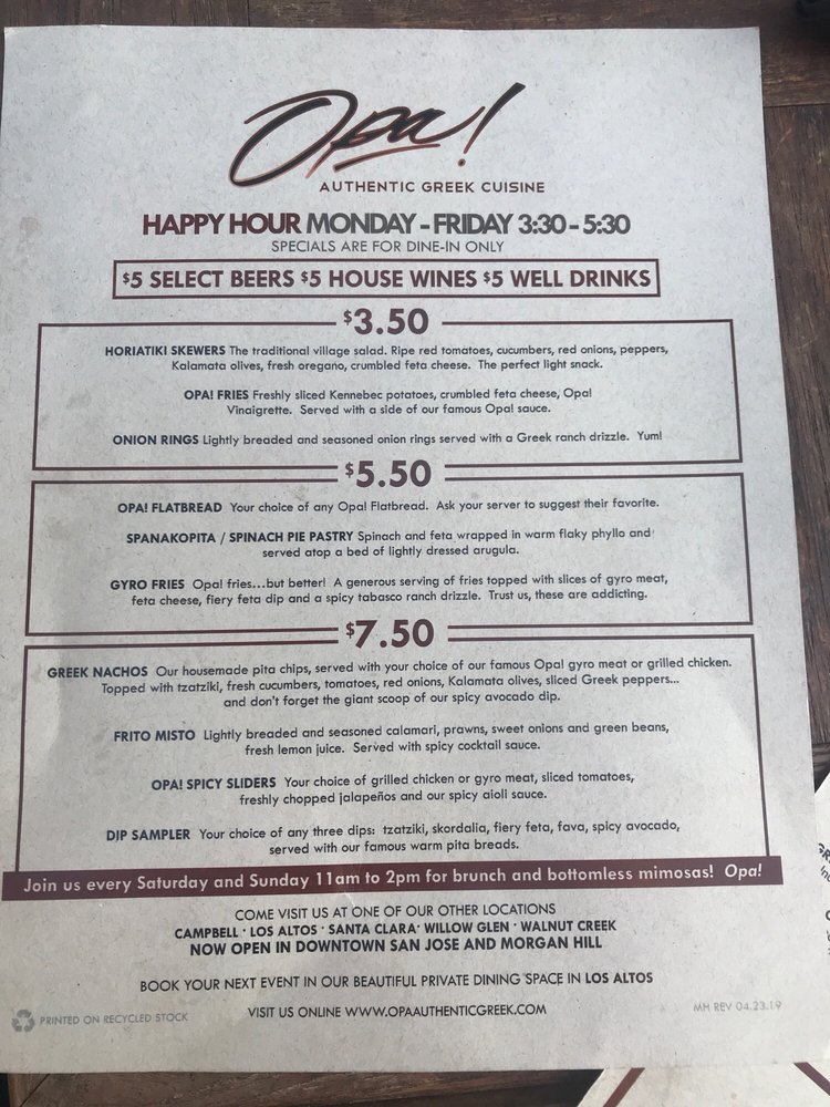 Opa! Authentic Greek - Campbell offers a diverse menu with Greek favorites like Opa Fries, Gyro Fries, Tzatziki Dip, and Greek Village Salad. The restaurant provides a range of amenities such as outdoor seating, free Wi-Fi, and a full bar. Customers rave about the quality of the food, with reviews mentioning dishes like lemon chicken orzo and oven-baked chicken with lemon cream sauce. The ambiance is described as casual, trendy, and romantic, perfect for a variety of occasions. With options for vegan, vegetarian, and gluten-free diets, Opa! Authentic Greek caters to a wide range of preferences. The restaurant's location in downtown Campbell makes it a popular choice for locals and visitors alike. Overall, Opa! Authentic Greek - Campbell receives praise for its delicious food, great service, and inviting atmosphere.